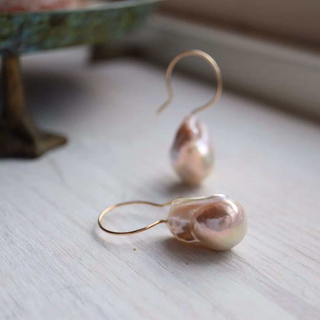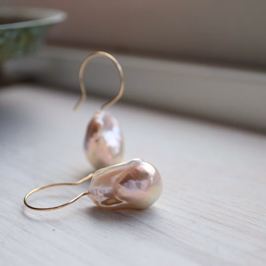 Örhängen i 18K återvunnet rött guld med stora rosa barocka pärlor.