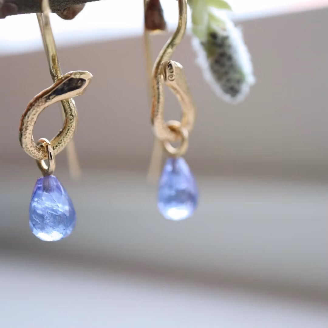 Från varje örhänge hängeren skimrande tanzanit, vars blåvioletta ton tillför ett vackert djup.