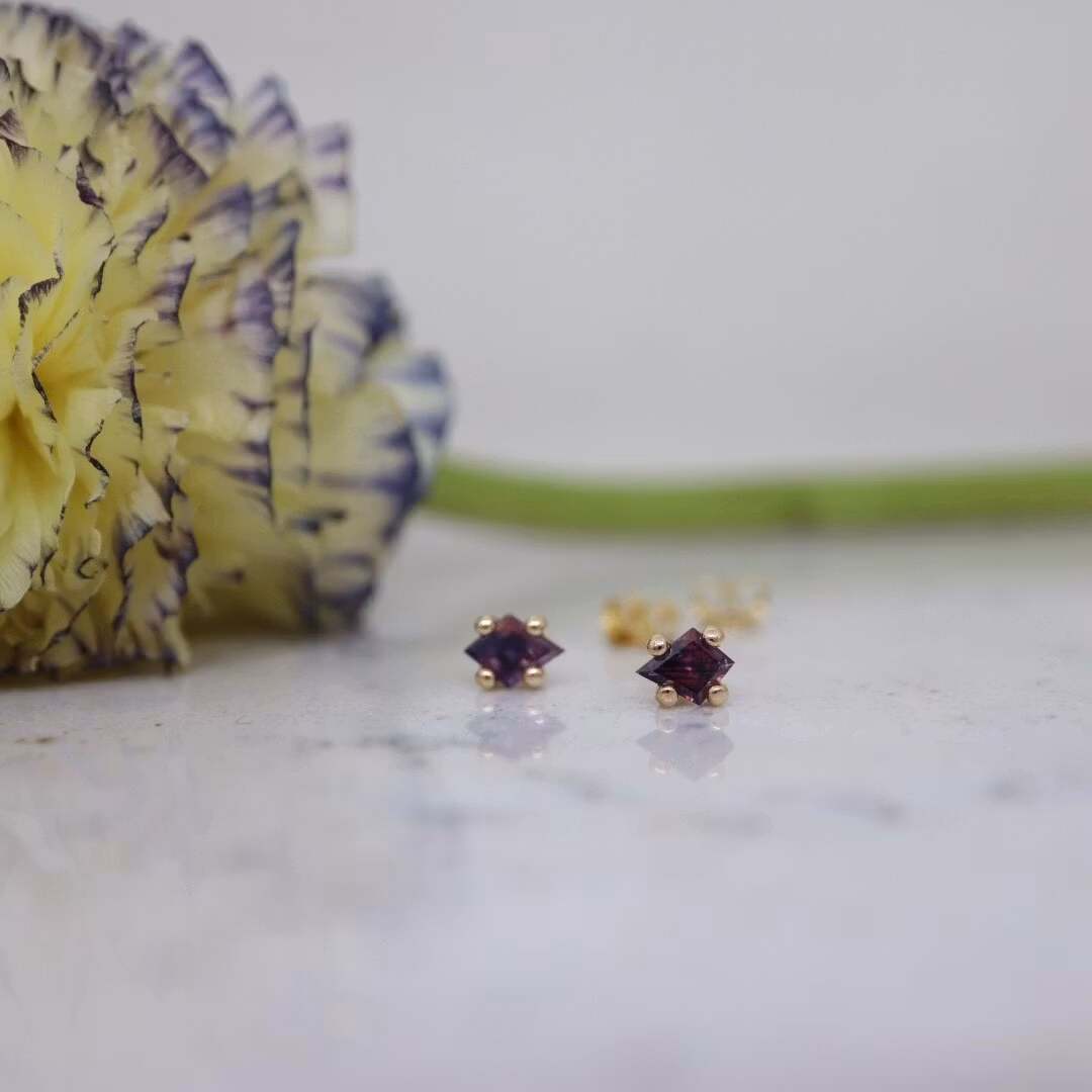 Örhängen i 18K rött guld med infattade Winza-safirer i rött med inslag av lila och liten stänk av blått.
